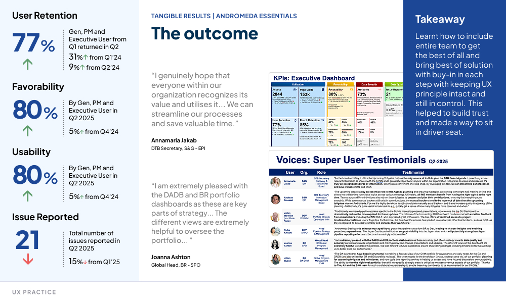 Enterprise Portfolio System (name changed) is a lighthouse initiative within a major pharmaceutical organization, designed to transform how innovative medicines move from concept to patient impact. By aggregating and harmonizing data from multiple fragmented systems into one unified platform, the product empowers the business with a single source of truth. This connected view enables faster decisionโmaking, streamlined workflows, and ultimately helps the organization bring lifeโchanging medicines to patients more quickly
